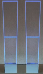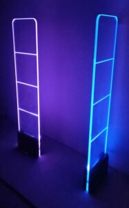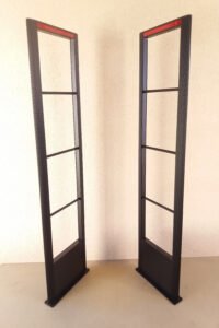 Acousto-magnétique AM (58 kHz) : idéale pour les grandes ouvertures et les galeries marchandes, grâce à sa synchronisation avec d’autres portiques AM distants et à sa résistance aux parasites.