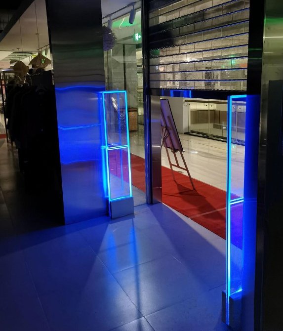 Eclairage bleu ou vert permanent et rouge en alarme.