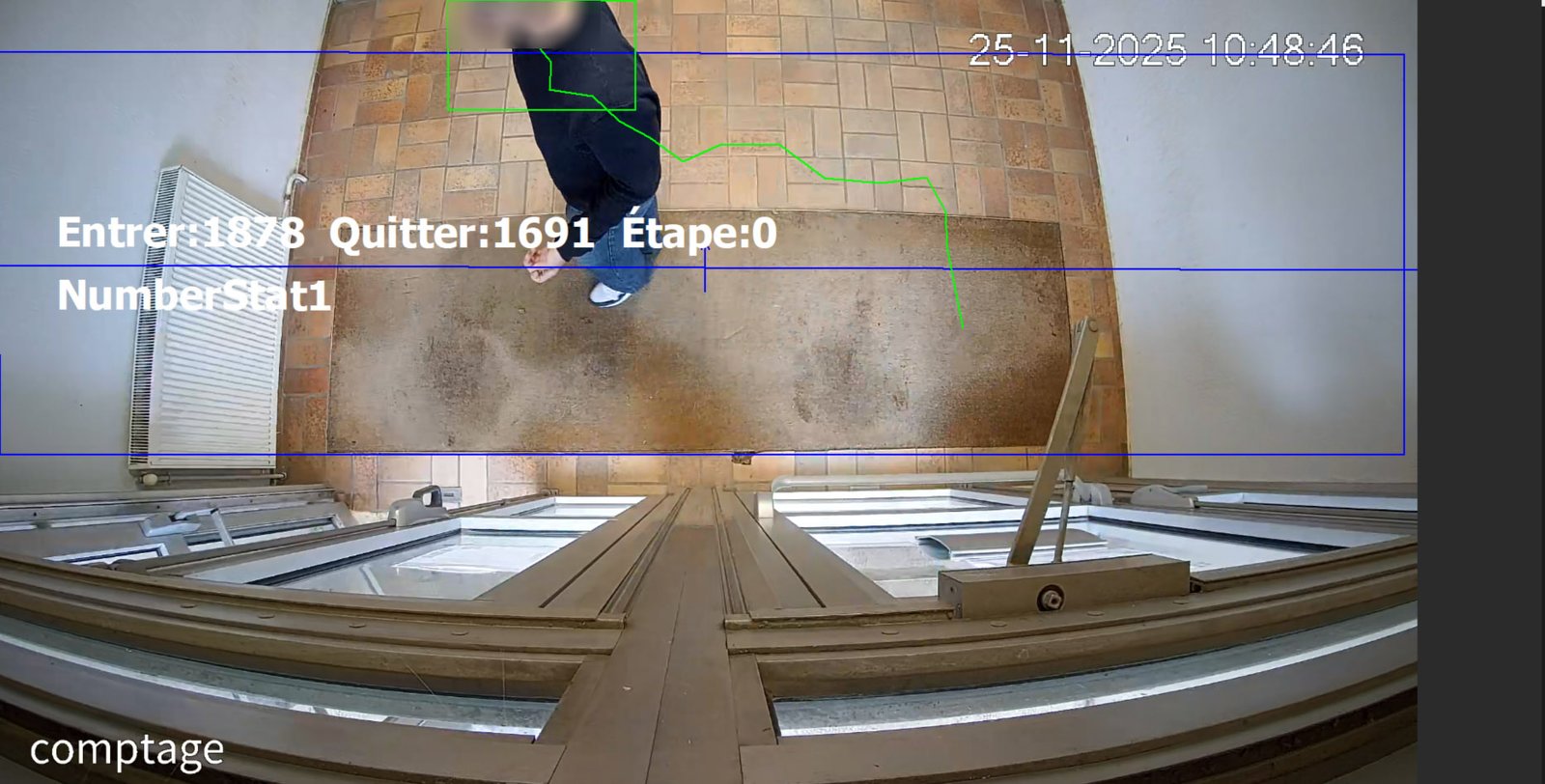 La caméra analyse le mouvement de la personne et incrémente le comptage lorsque celle-ci a rempli les critères définis, tels que le franchissement complet d’une ligne virtuelle, une trajectoire valide dans la zone d’intérêt, une durée de présence minimale ou l’absence de retour en arrière (anti-rebond), afin d’éviter les doubles comptages et garantir une précision optimale du comptage.